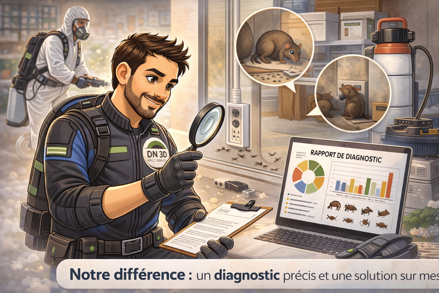 Chez DN 3D Multi Services, nous sommes convaincus qu’un traitement efficace contre les nuisibles ne se résume pas à appliquer un produit. C’est pourquoi chaque intervention débute par un diagnostic précis et expliqué, afin de proposer une solution réellement adaptée à la situation, sans surtraitement inutile. Nous privilégions une approche sur mesure, fondée sur l’analyse du lieu, du niveau d’infestation et des risques spécifiques, avec des méthodes professionnelles réglementées et raisonnées.
