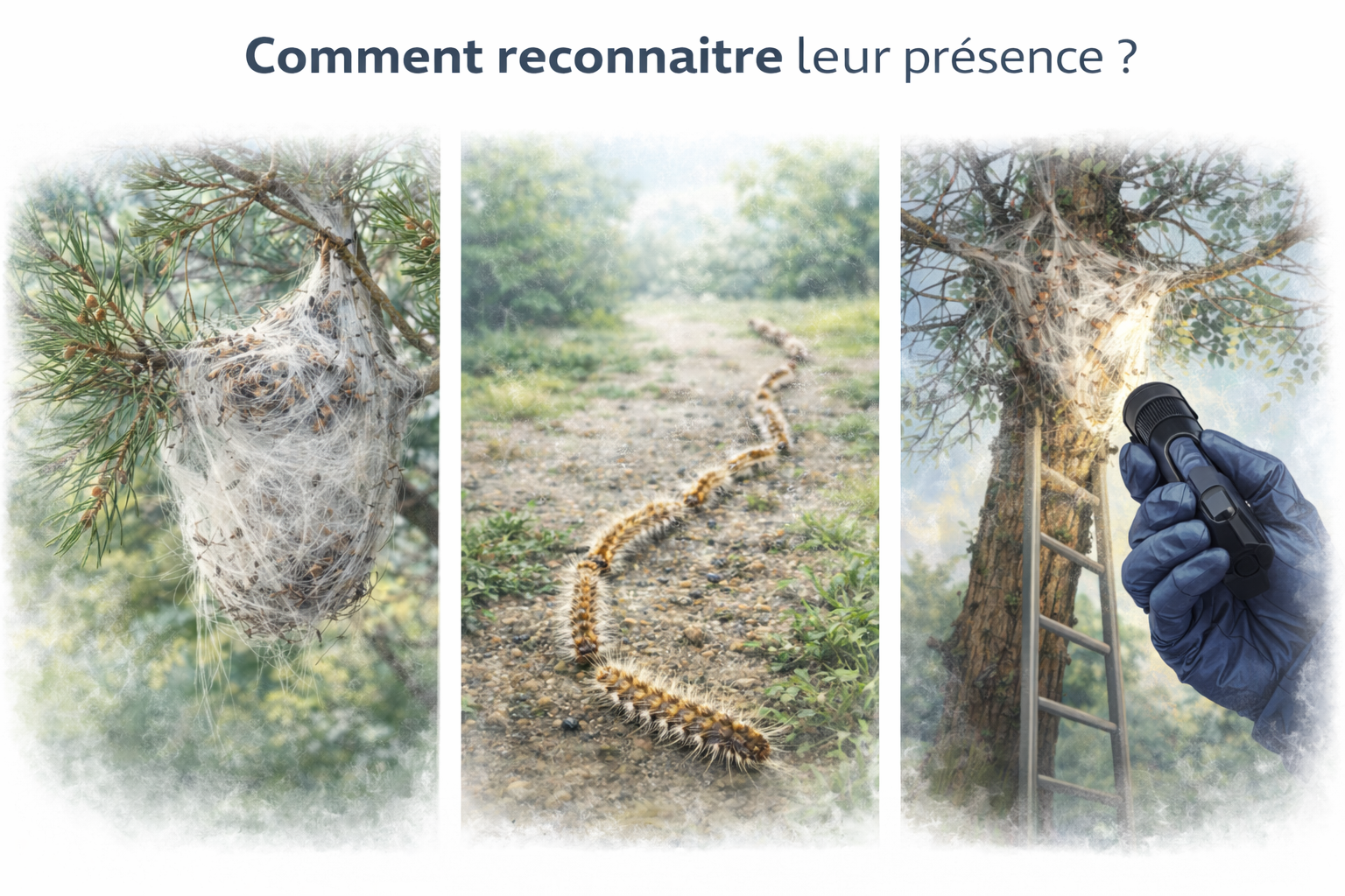 Les chenilles processionnaires sont des insectes présents principalement dans les pins et les chênes. Elles sont reconnaissables à leur déplacement en file indienne et à la présence de nids blancs soyeux dans les arbres.